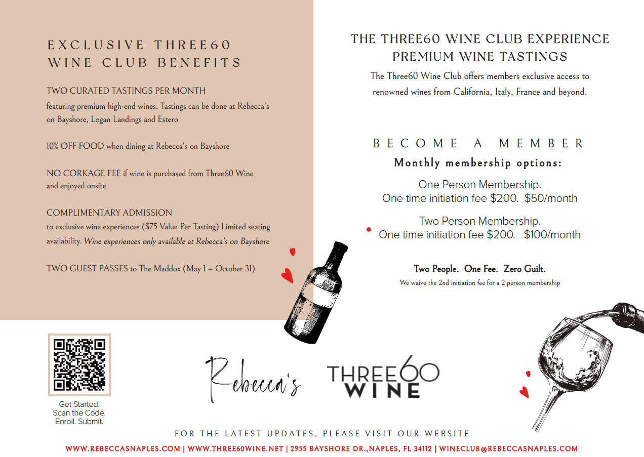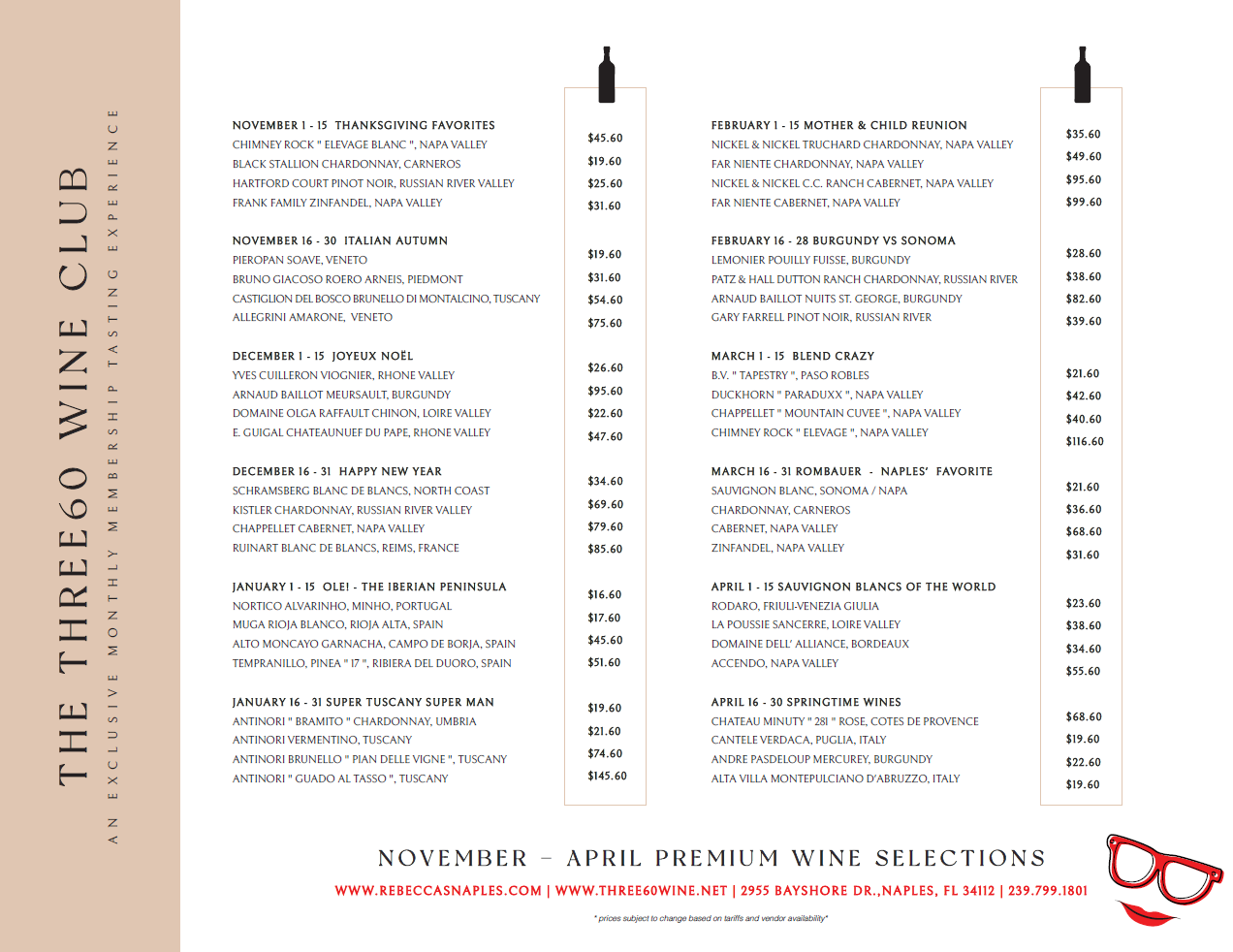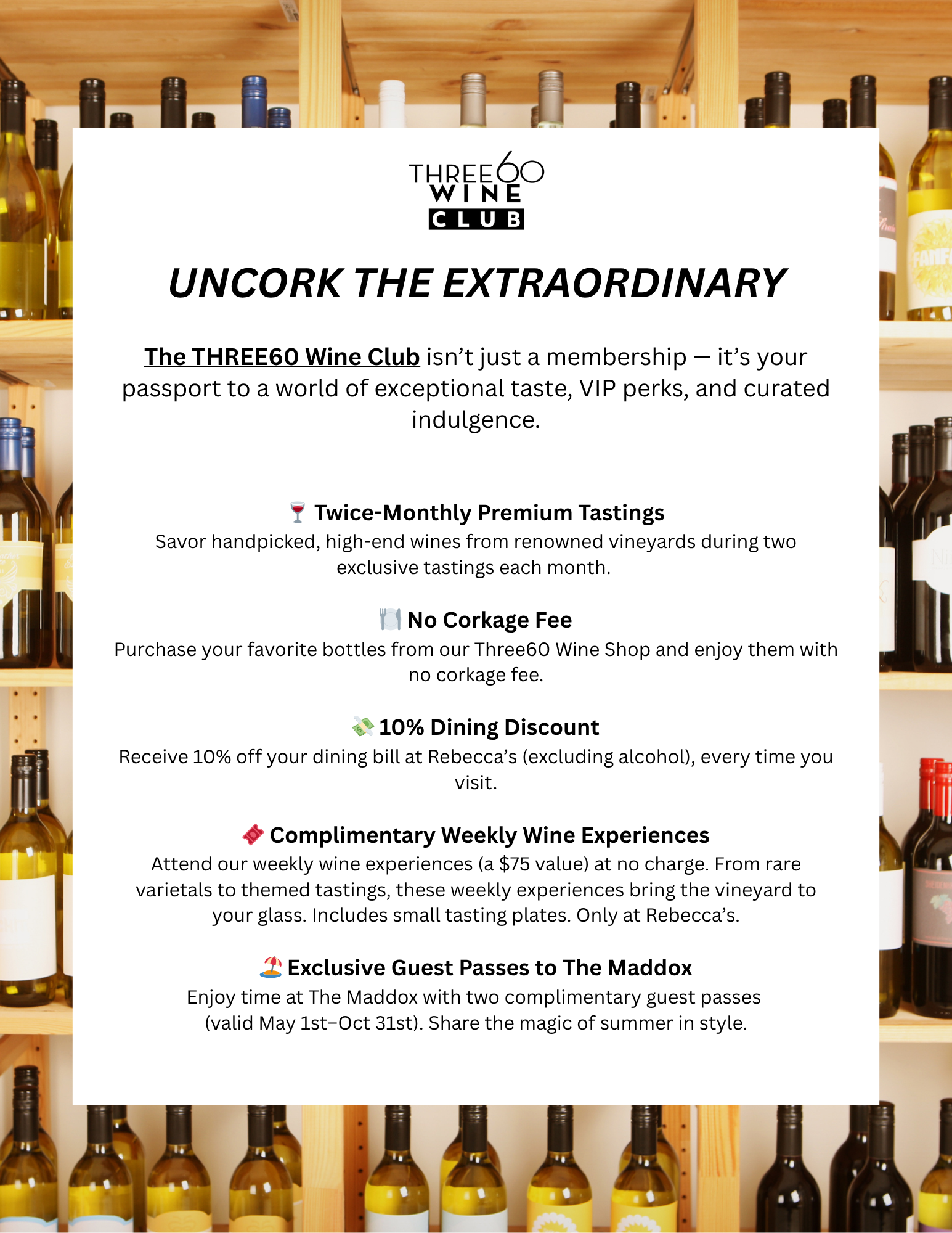 The Three60 Wine Club offers members exclusive access to renowned, premium wines from California, Italy, France and all around the world. Imagine savoring the finest wines from across the globe every month, all in one place - welcome to The Three60 Wine Club.